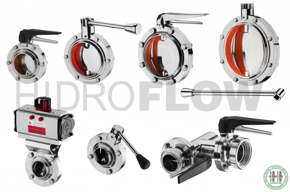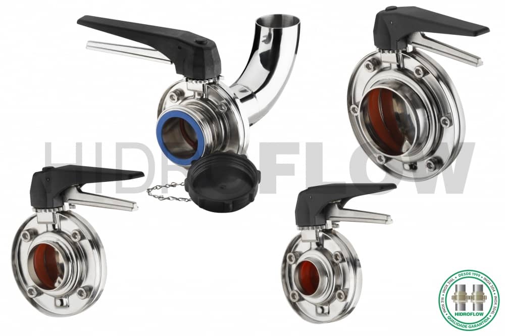 As válvulas borboleta sanitárias maciças , operadas manualmente ou automaticamente, podem ser usadas na maioria das aplicações de produtos líquidos nas indústrias de processamento de alimentos, farmacêutica e química.